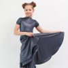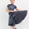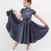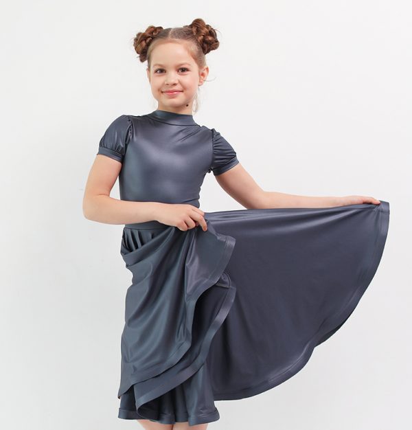 Боди  с воротником стойка по переду, V-образным вырезом горловины спинки и рукавом «фонарик», создает очень яркий  образ маленькой танцовщицы. Точный крой и идеальная посадка боди обеспечивают комфорт и удобство, а «1,5 солнца» юбки, выполненной из великолепного бифлекса, не только прекрасно выглядит, но и позволяет выполнить любые танцевальные движения. Низ юбки посажен на регилин. Роскошный бифлекс BEVERLY имеет прекрасный матовый блеск, напоминающий блеск натуральной кожи, а  великолепные сложные оттенки тканей данного артикула ставят финальную точку в образе, делая его одновременно загадочным и очень нарядным.