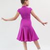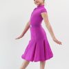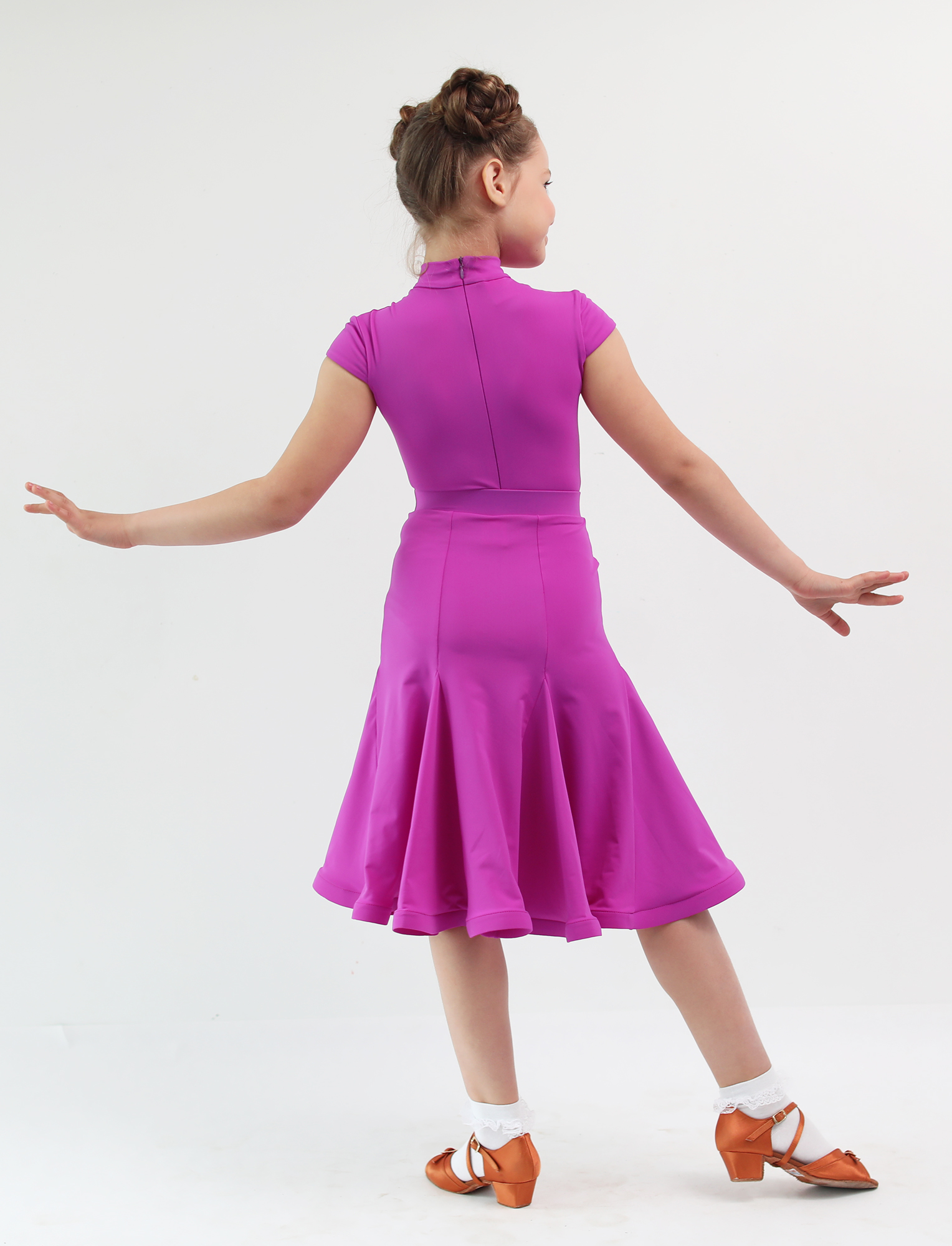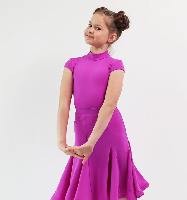 Боди, из итальянского бифлекса высочайшего качества, с воротником стойкой и маленьким втачным рукавом-крылышком, в дуэте с юбкой-годе, создают очень лаконичный образ маленькой танцовщицы. Юбка, прекрасно скроена, подчеркивает фигуру, вытягивает силуют , и позволяет выполнить любые танцевальные движения, а объем ей придает регилин. Прекрасно дополняет это платье пурпурный цвет. А точный крой и идеальная посадка обеспечивают комфорт и удобство.
